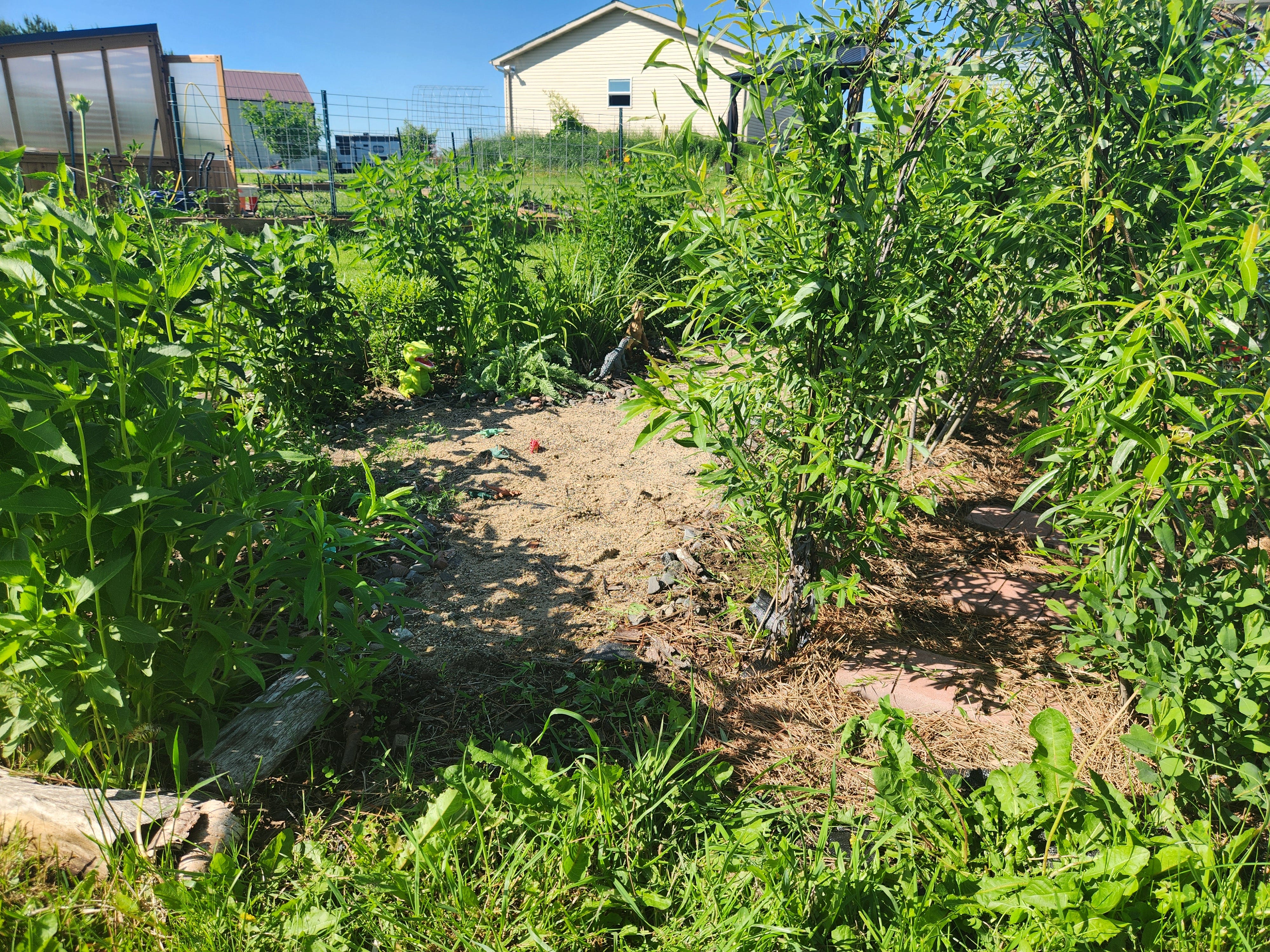 Now, the willow tunnel is a beautiful mess of green, sitting next to the dino garden.