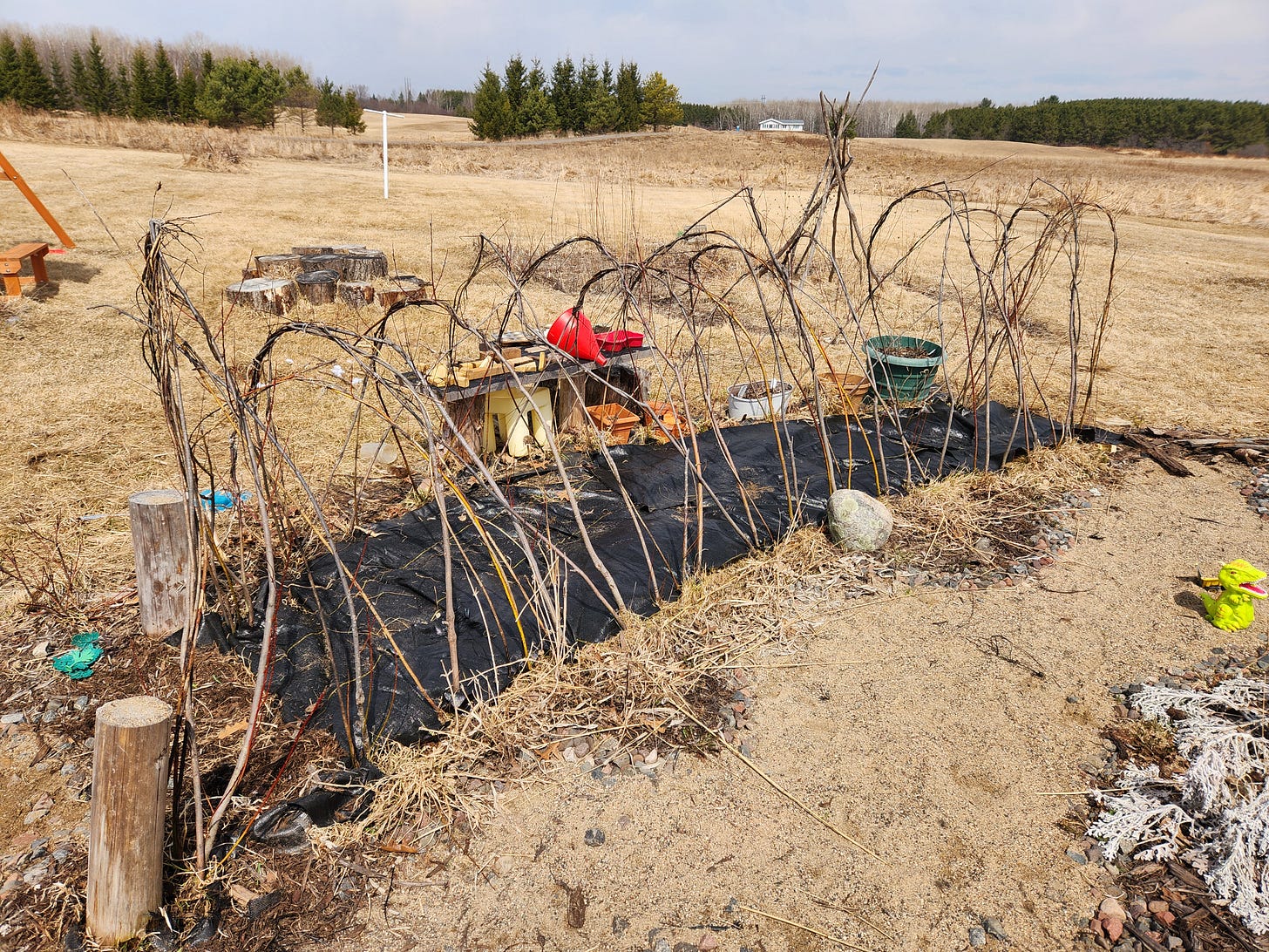 I used landscaping fabric around the base of the willow whips and underneath the tunnel. After my willow dome debacle, I opted to use fabric because the weeds were just too prolific and the small tunnel made it difficult to access and unsafe to weed whip. I know that landscape fabric is controversial in some spaces, understandably so. Most of my gardens have cardboard underneath a deep mulch. There are benefits to both methods!